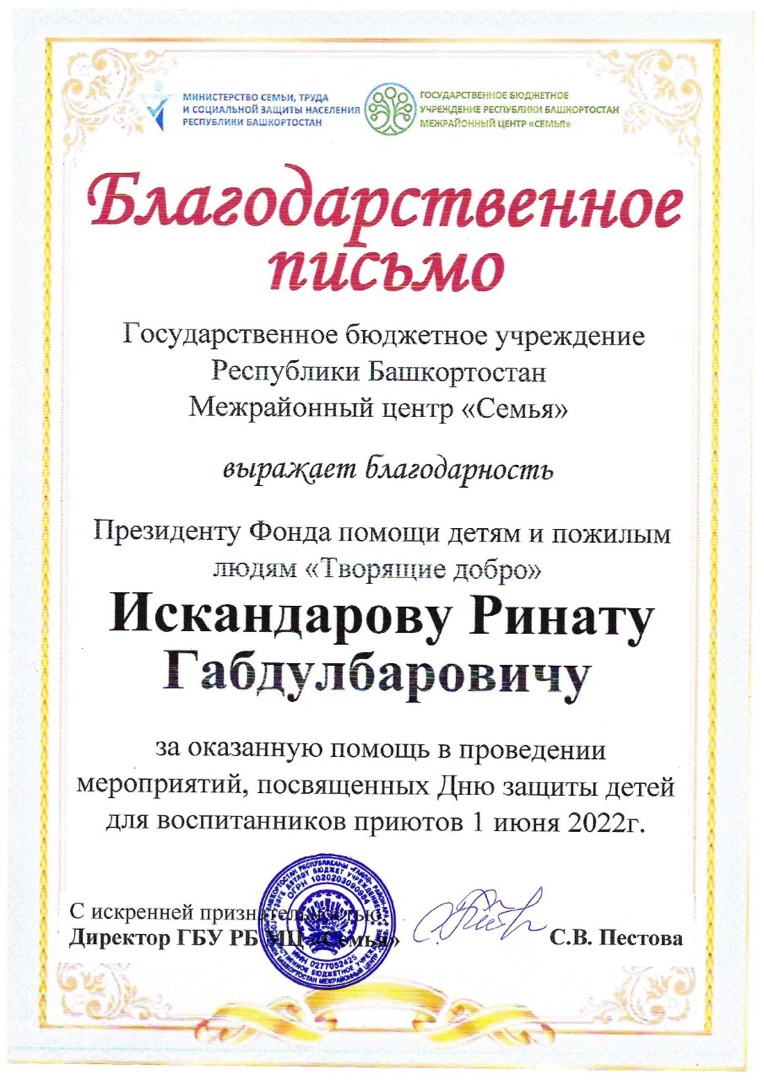 Государственное бюджетное учреждение Республики Башкортостан Межрайонный центр «Семья» выражает благодарность Президенту Фонда помощи детям и пожилым людям «Творящие Добро» Искандарову Ринату Габдулбаровичу за оказанную помощь в проведении мероприятий, посвященных Дню защиты детей для воспитанников приютов 1 июня 2022г.