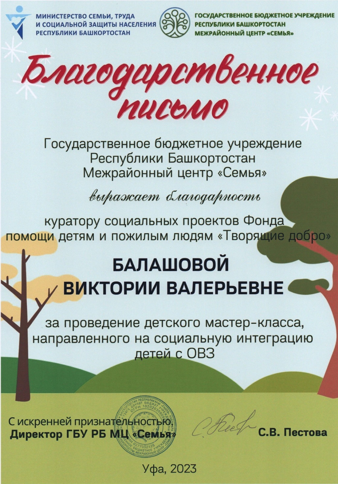 Государственное бюджетное учреждение Республики Башкортостан Межрайонный центр «Семья» выражает благодарность Президенту Фонда помощи детям и пожилым людям «Творящие добро» Искандарову Ринату Габдулбаровичу за благотворительную помощь детям, вынужденных переселенцев и семей, потерявших близких родственников на СВО