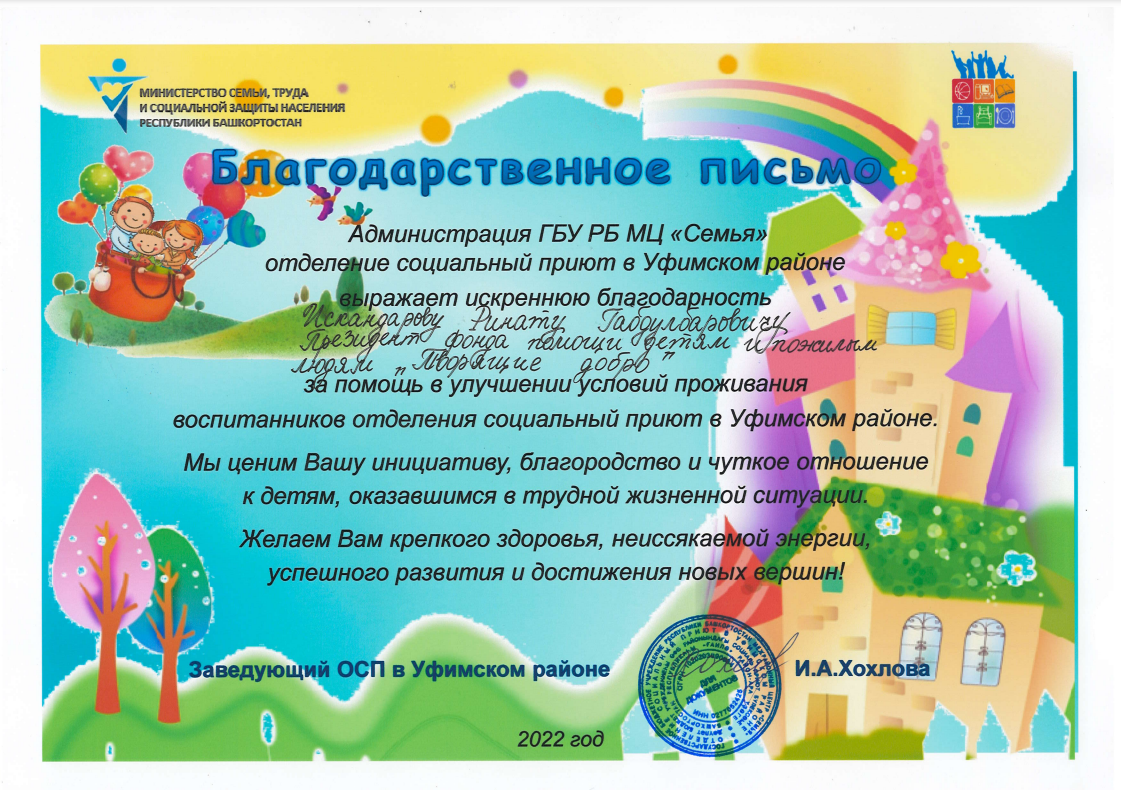 Администрация ГБУ РБ МЦ «Семья» отделение социальный приют в Уфимском районе выражает искреннюю благодарность Искандарову Ринату Габдулбаровичу, Президенту Благотворительного фонда «Творящие Добро» за помощь в улучшении условий проживания воспитанников отделения социальный приют в Уфимском районе. Мы ценим Вашу инициативу, благородство и чуткое отношение к детям, оказавшимся в трудной жизненной ситуации. Желаем Вам крепкого здоровья, неиссякаемой энергии, успешного развития и достижения новых вершин!
