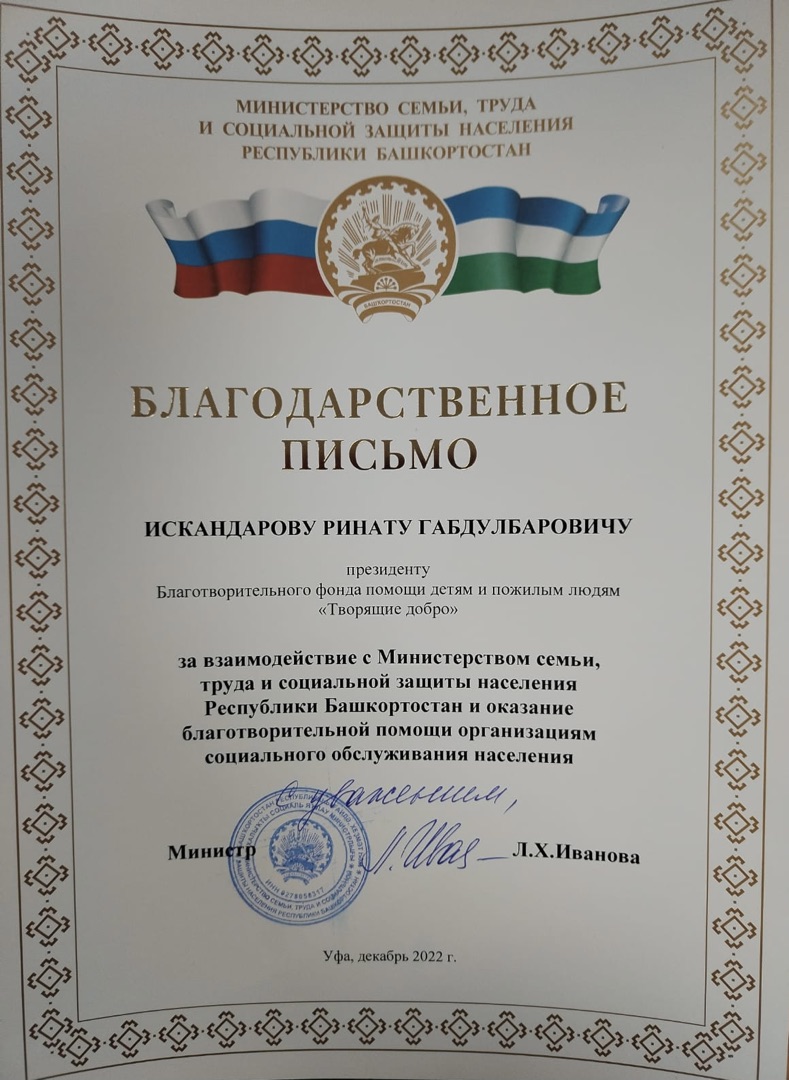 Искандарову Ринату Габдулбаровичу, Президенту Благотворительного фонда помощи детям и пожилым людям «Творящие Добро», за взаимодействие с Министерством семьи, труда и социальной защиты населения Республики Башкортостан и оказание благотворительной помощи организациям социального обслуживания населения