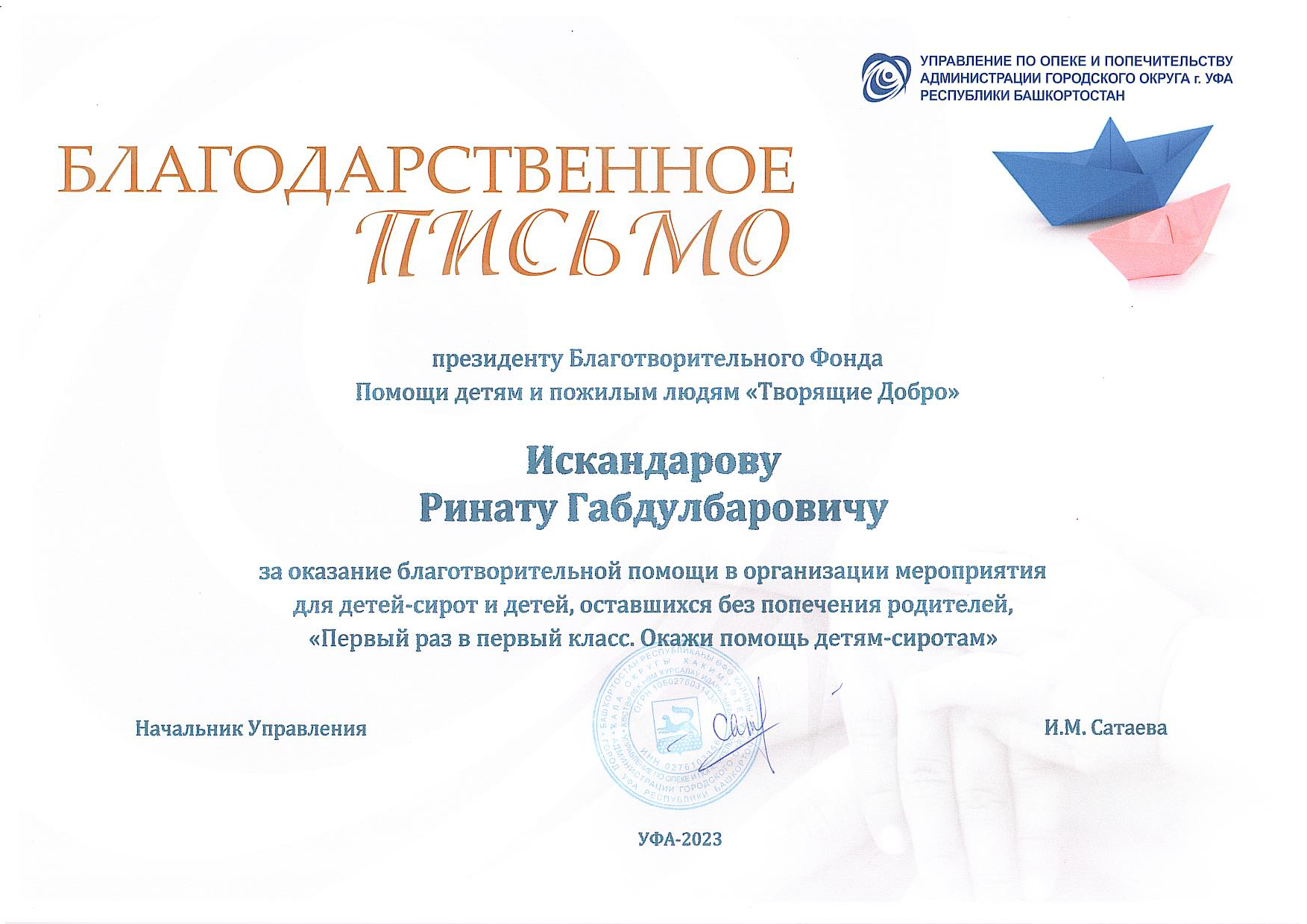 Президенту благотворительного фонда помощи детям и пожилым людям «Творящие Добро» Искандарову Ринату Габдулбаровичу за оказание благотворительной помощи в организации мероприятия для детей-сирот и детей, оставшихся без попечения родителей, «Первый раз в первый класс. Окажи помощь детям-сиротам»