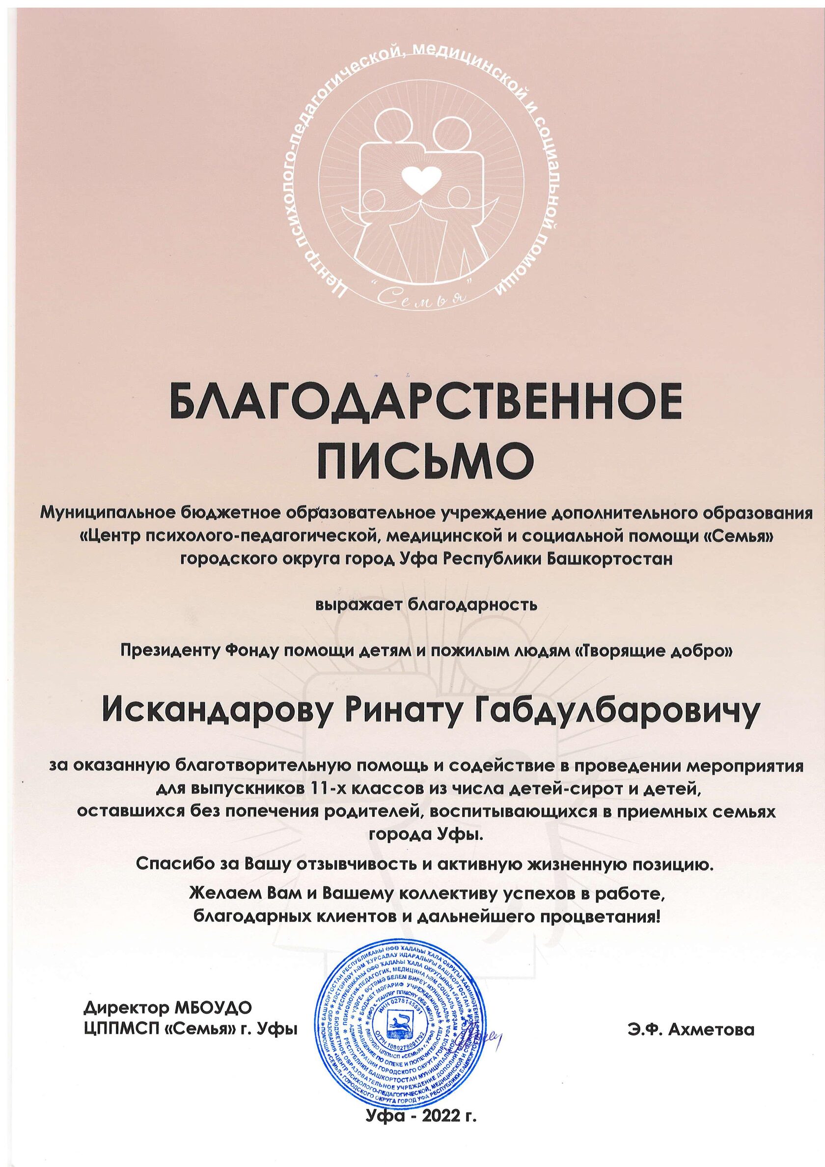 Муниципальное бюджетное образовательное учреждение дополнительного образования «Центр психолого-педагогической, медицинской и социальной помощи «Семья» городского округа город Уфа Республики Башкортостан выражает благодарность Президенту Фонда помощи детям и пожилым людям «Творящие Добро» Искандарову Ринату Габдулбаровичу за оказанную благотворительную помощь и содействие в проведении мероприятия для выпускников 11-х классов из числа детей-сирот и детей, оставшихся без попечения родителей, воспитывающихся в приемных семьях города Уфы. Спасибо за Вашу отзывчивость и активную жизненную позицию. Желаем Вам и Вашему коллективу успехов в работе, благодарных клиентов и дальнейшего процветания!