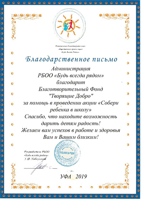 РБОО «Будь всегда рядом» благодарит Благотворительный Фонд «Творящие Добро» за помощь в проведении акции «Собери ребенка в школу» Спасибо, что находите возможность дарить детям радость!
