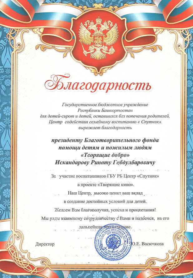 Администрация государственного бюджетного учреждения Республики Башкортостан Межрайонный центр «Семья» отделение социальный приют в Уфимском районе выражает благодарность Искандарову Ринату Габдулбаровичу Президенту благотворительного фонда помощи детям и пожилым людям «Творящие Добро» за оказание благотворительной помощи воспитанникам отделения социальный приют в Уфимском районе Республике Башкортостан.