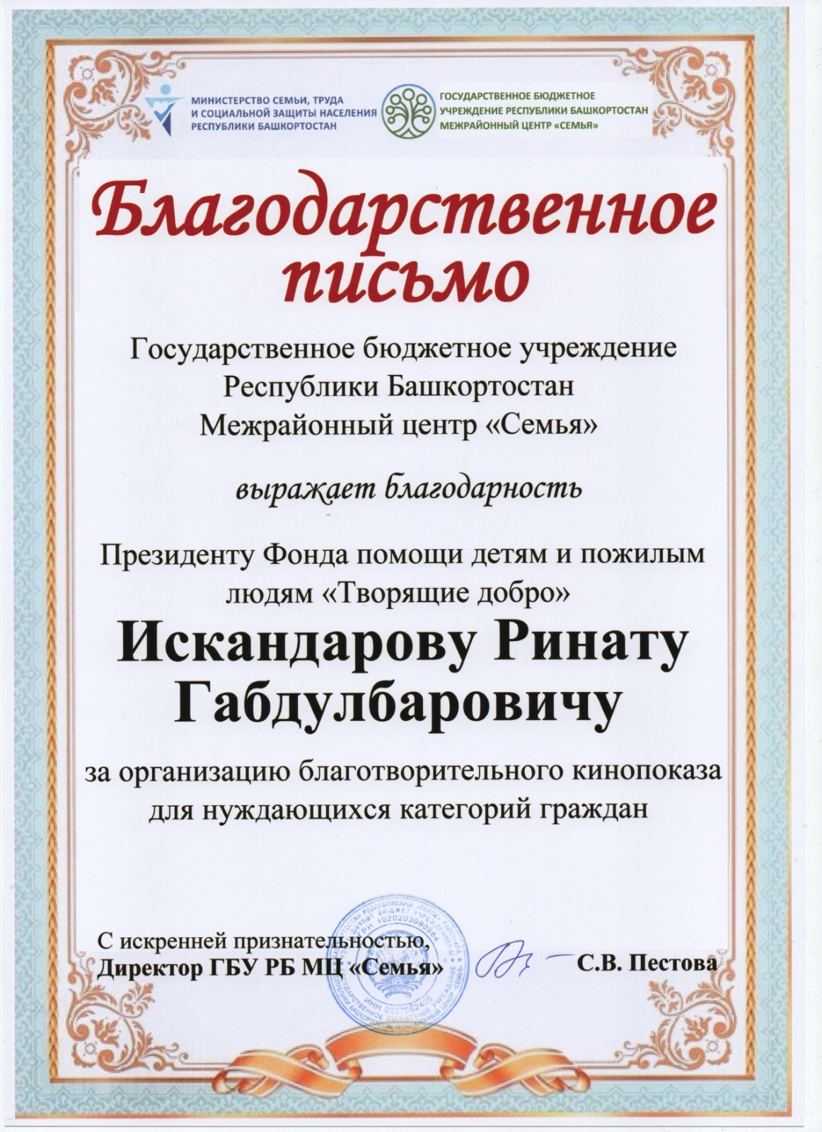 ГБУ РБ Межрайонный центр «Семья» выражает благодарность Президенту благотворительного фонда помощи детям и пожилым людям «Творящие Добро» Искандарову Ринату Габдулбаровичу за организацию благотворительного кинопоказа для нуждающихся категорий граждан